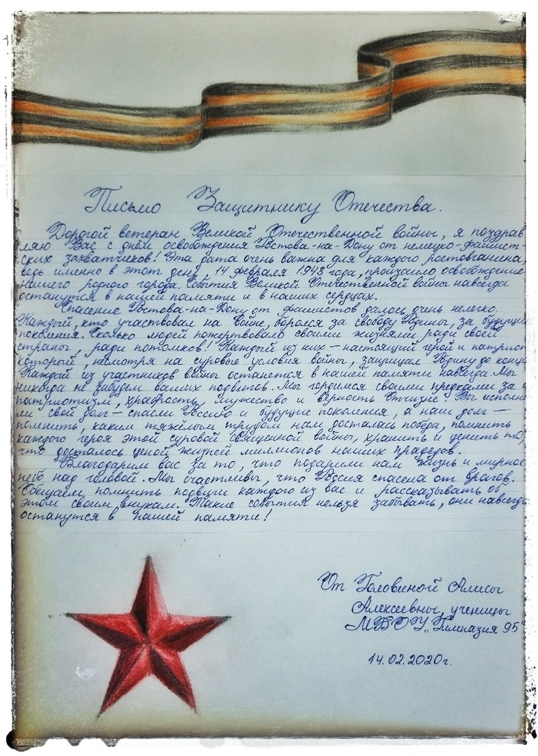 13 февраля 2020 года ученики гимназии приняли участие в торжественном мероприятии в патриотическом центре «Победа», посвященном Дню мужества и началу акции ростовских школьников «Письмо в бессмертный полк». В рамках Акции предполагается личное участие ростовских школьников которые напишут письма своим родственникам, участвовавшим в Великой Отечественной войне, солдатам, воинам. В период проведения акции и в течение мая, творческие работы, по мере их поступления, будут представлены на публичной выставке «Письмо в Бессмертный полк», публиковаться СМИ, размещаться на официальных Интернет ресурсах, транслироваться в эфире радиостанций.