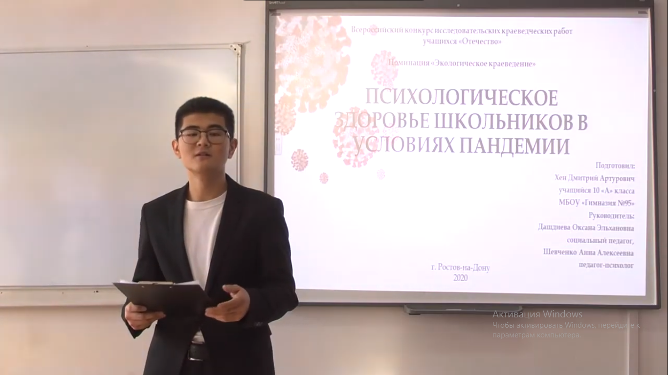 5. Подсекция «Экологическое краеведение», Хен Дмитрий, 10 «А» класс, «Психологическое здоровье школьников в условиях пандемии», рук. Дашдиева Оксана Эльхановна, Шевченко Анна Алексеевна- 3 место