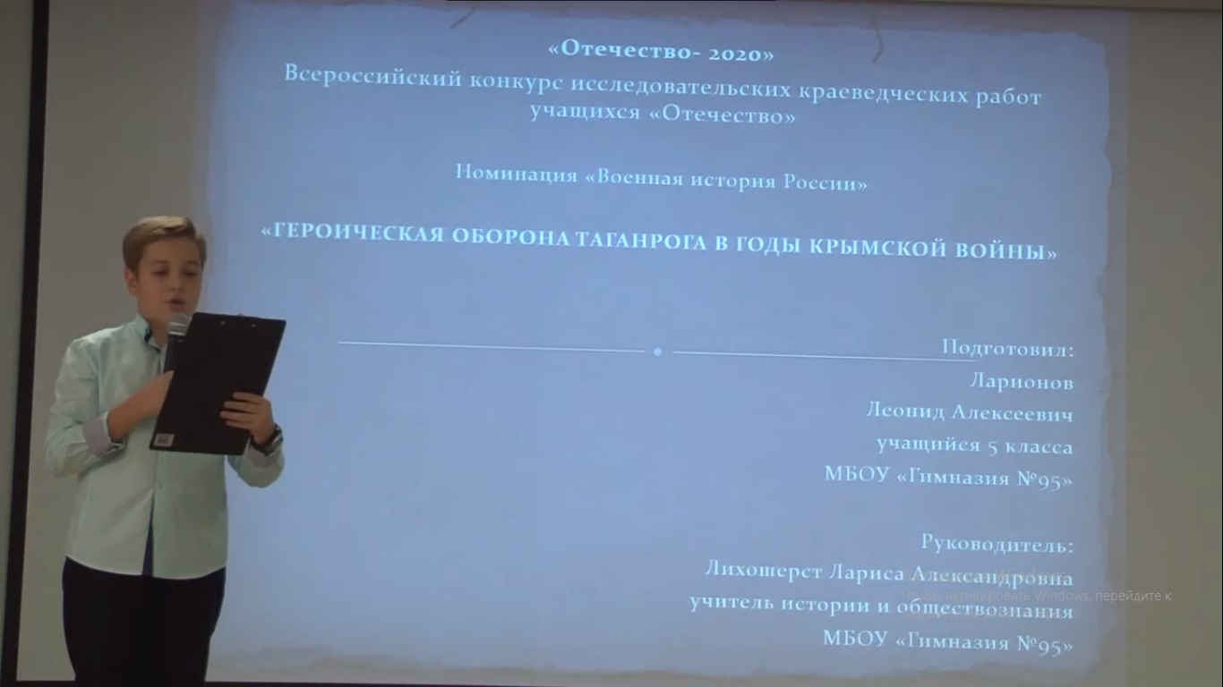 2. Подсекция «Военная история России», Ларионов Леонид, 5 «Б» класс, «Героическая оборона Таганрога в годы Крымской войны» рук. Лихошерст Лариса Александровна – 2 место