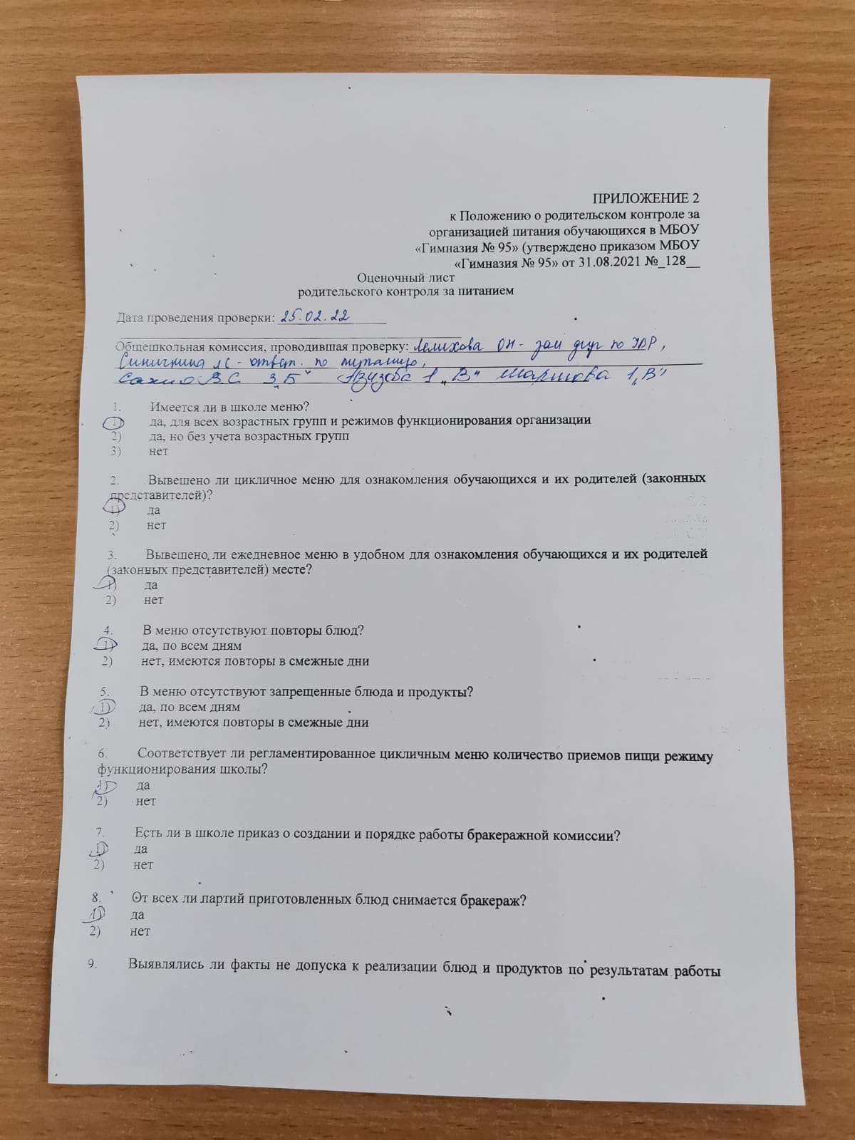 24 февраля в гимназии состоялся плановый родительский контроль за осуществлением питания школьников. В ходе проверки были изучены следующие моменты: соответствие блюд и меню, бракеражный журнал, санитарное состояние обеденного зала до приёма пищи и после, соблюдение правил личной гигиены учащимися, вкусовые предпочтения детей. Замечаний в ходе проверки не было. Комиссия в соответствии с Положением о родительском контроле за организацией питания обучающихся в МБОУ Гимназия 95 заполнила оценочной лист родительского контроля.