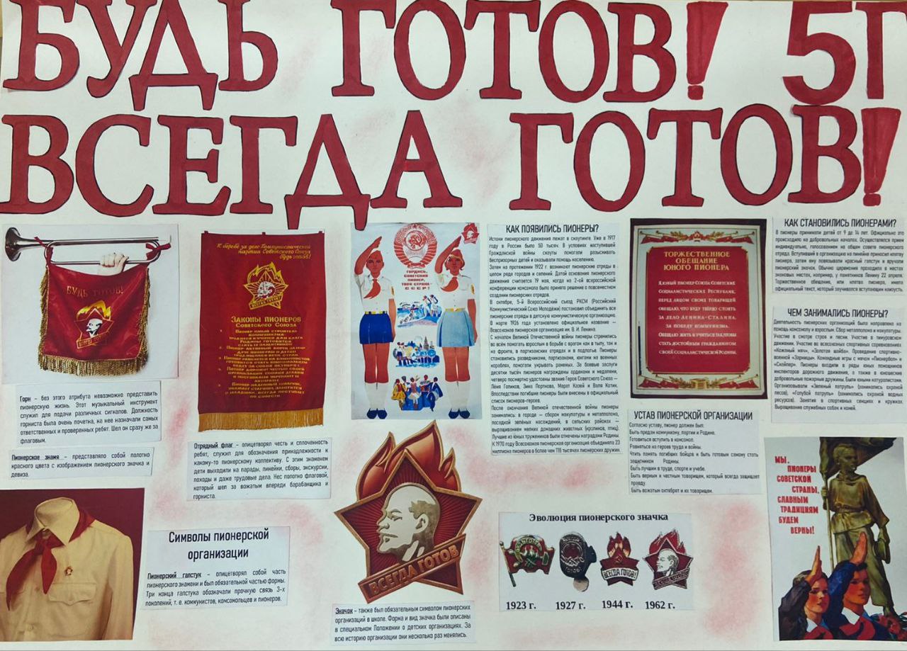 Ко Дню Пионерии, который отмечается 19 мая, в фойе нашей гимназии была размещена выставка плакатов . Экспозиция рассказывает о создании и развитии организации, которая объединила десятки тысяч детей по всему Советскому Союзу. У них были свои законы и свой устав, юных граждан учили быть честными и смелыми, ответственными и готовыми оказать помощь тому, кто в ней нуждается.