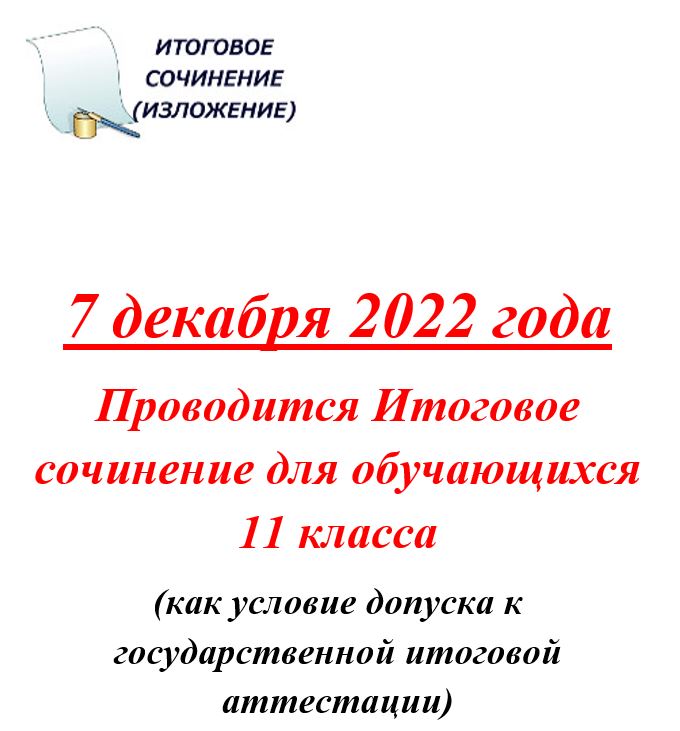 7 декабря 2022 года Проводится Итоговое сочинение для обучающихся 11 класса (как условие допуска к государственной итоговой аттестации)