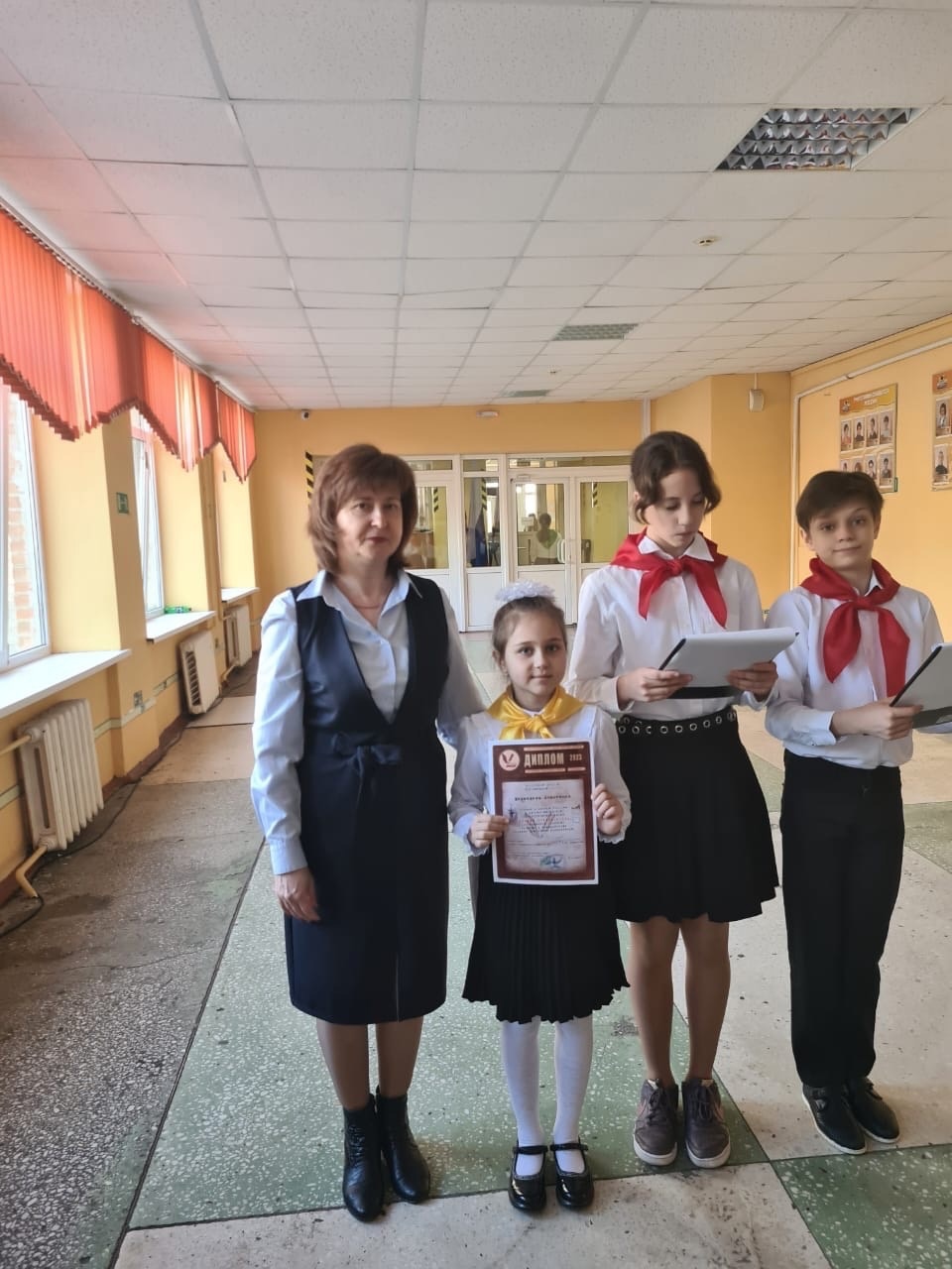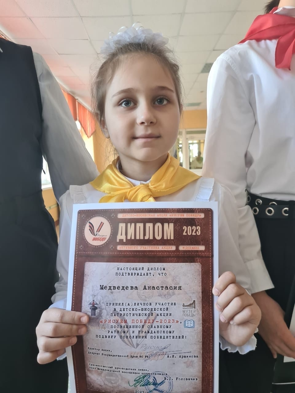 Диплом Всероссийской Патриотической Акции «Рисуем Победу» получила ученица 2 «А»класса Медведева Анастасия. Благодарственным письмом за подготовку участника была награждена Синичкина Любовь Сергеевна.