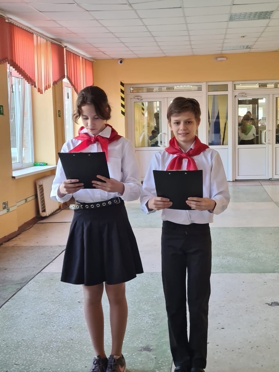Стихотворение читал Дубровин Михаил, а право поднять флаг РФ предоставилось лучшим ученикам 6 «А» класса: Пузикову Платону- отличнику учебы, победителю Международного кубка «Спартак юниор», призеру и участнику городских и всероссийских турниров по футболу.