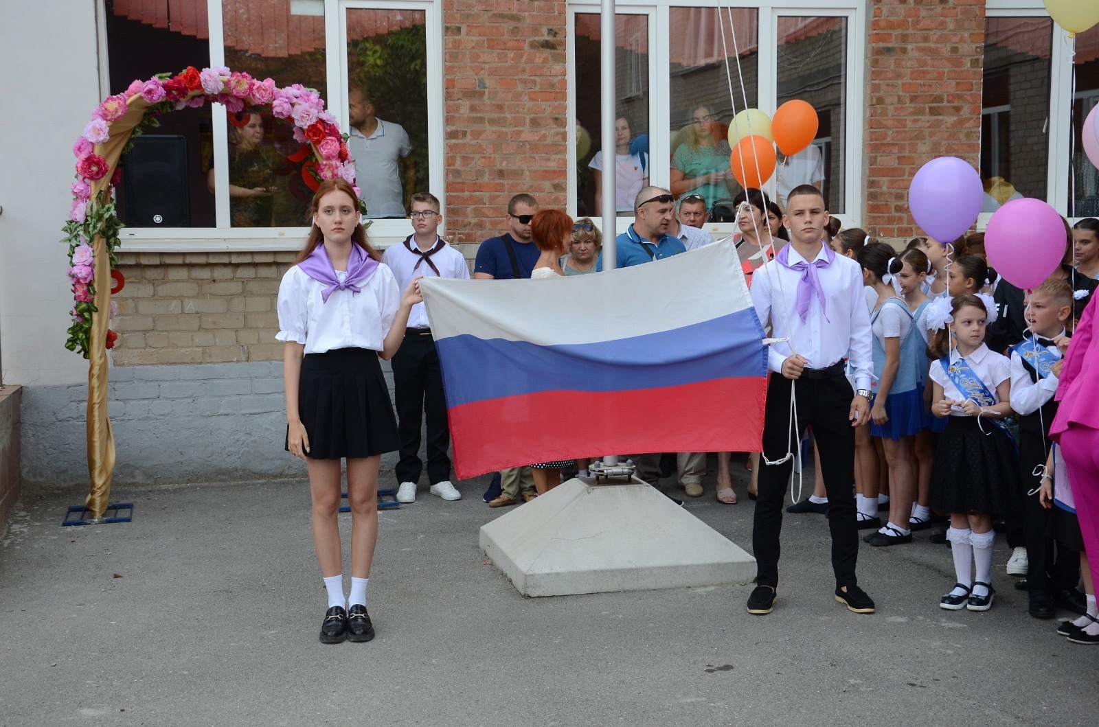 Право поднять флаг представилось учащимся 11 — ого класса Никитиной Алисе и Котову Степану.