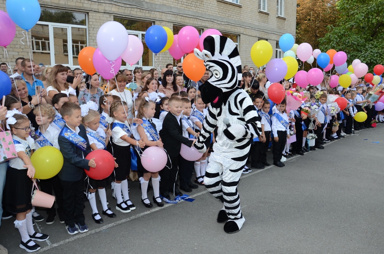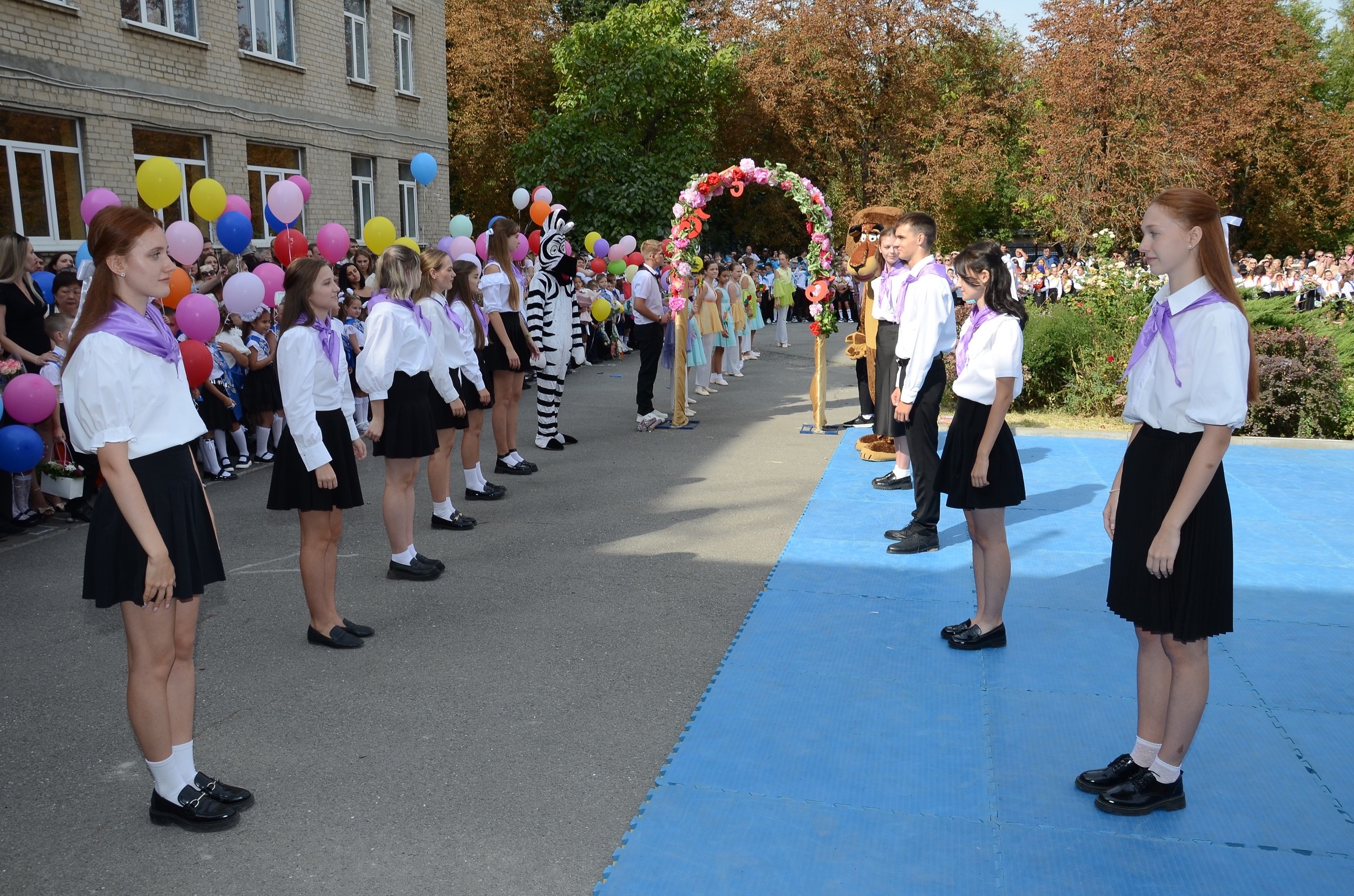 Поздравить учащихся приходили герои из мультика лев Алекс и зебра Мартин