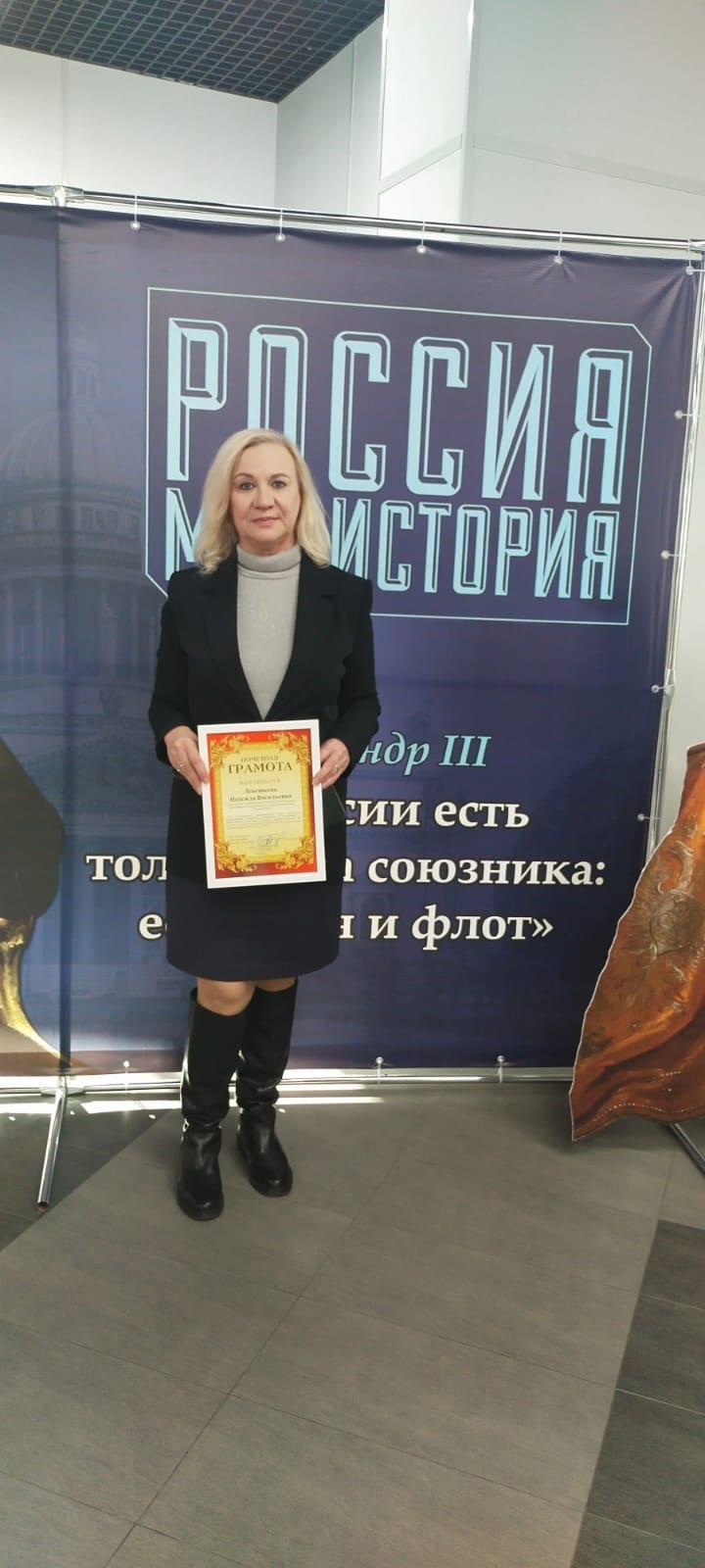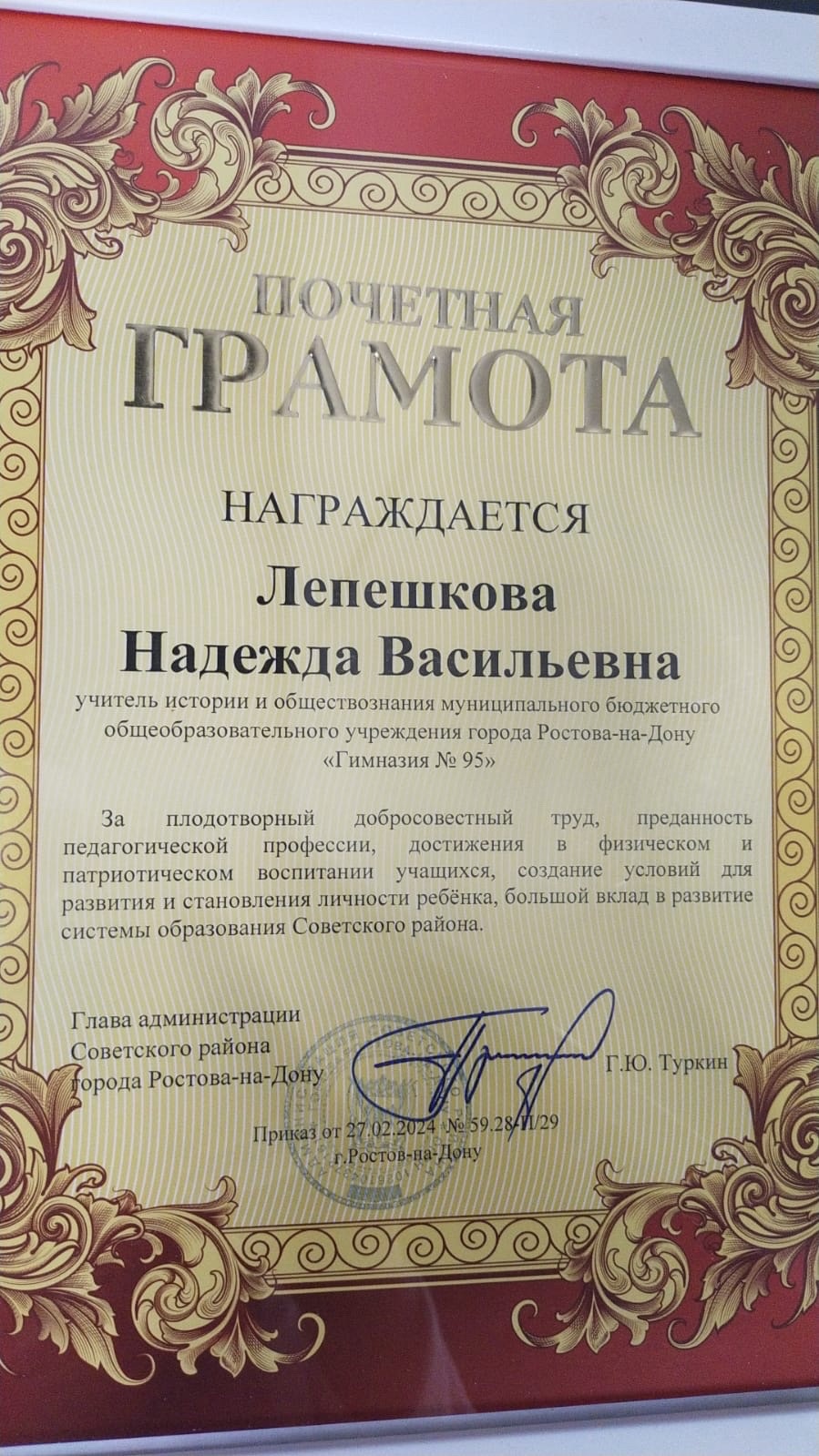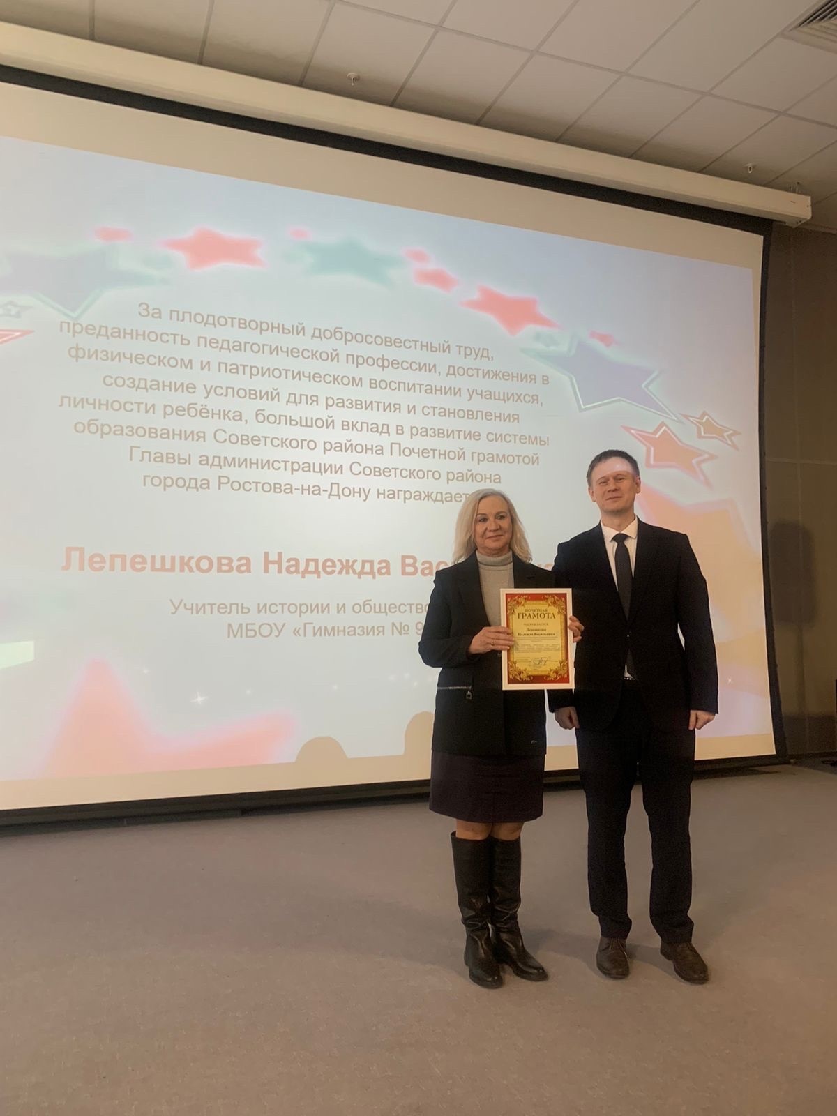 Почетной грамотой награждена руководитель школьного музея, учитель истории и обществознания Лепешкова Надежда Васильевна за плодотворный добросовестный труд, преданность педагогической профессии, достижения в физическом и патриотическом воспитании учащихся, создания условий для развития и становления личности ребенка, большой вклад в развитие системы образования Советского района.
