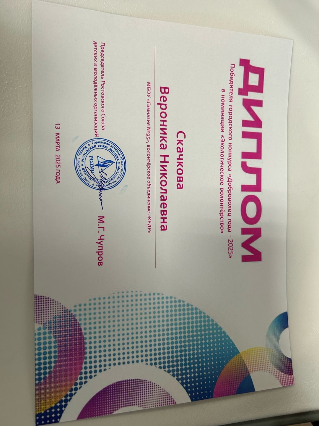 Сайт муниципального бюджетного общеобразовательного учреждения города Ростова-на-Дону "Гимназия № 95" > Основная > 🌟Поздравляем Скачкову Веронику с ПОБЕДОЙ в городском конкурсе «Доброволец года 2025″🎉